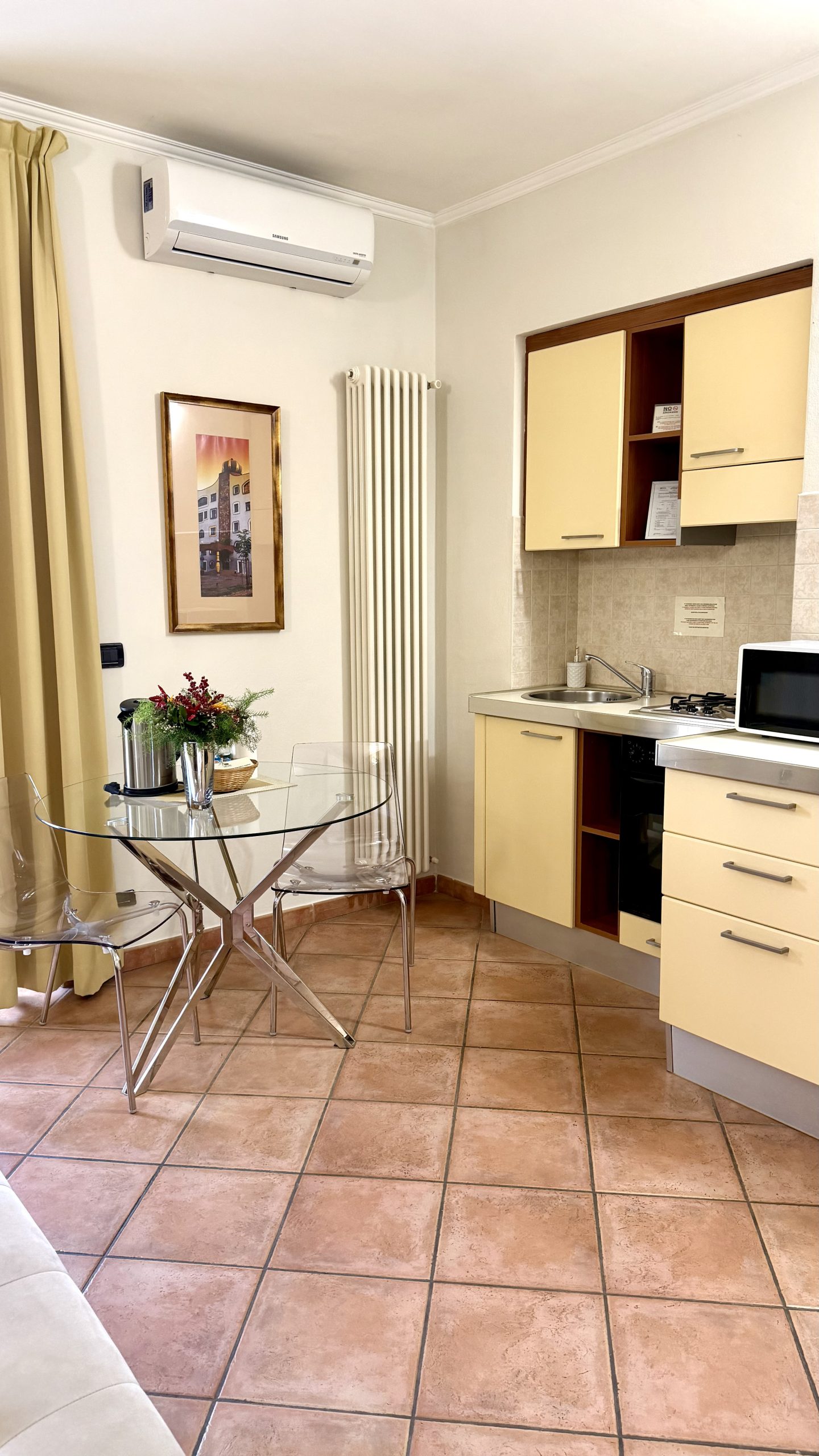 - Cucina completamente attrezzato con piano cottura, frigorifero con congelatore, utensili, stoviglie, forno microonde, bollitore elettrico e macchina a cialde per il caffè